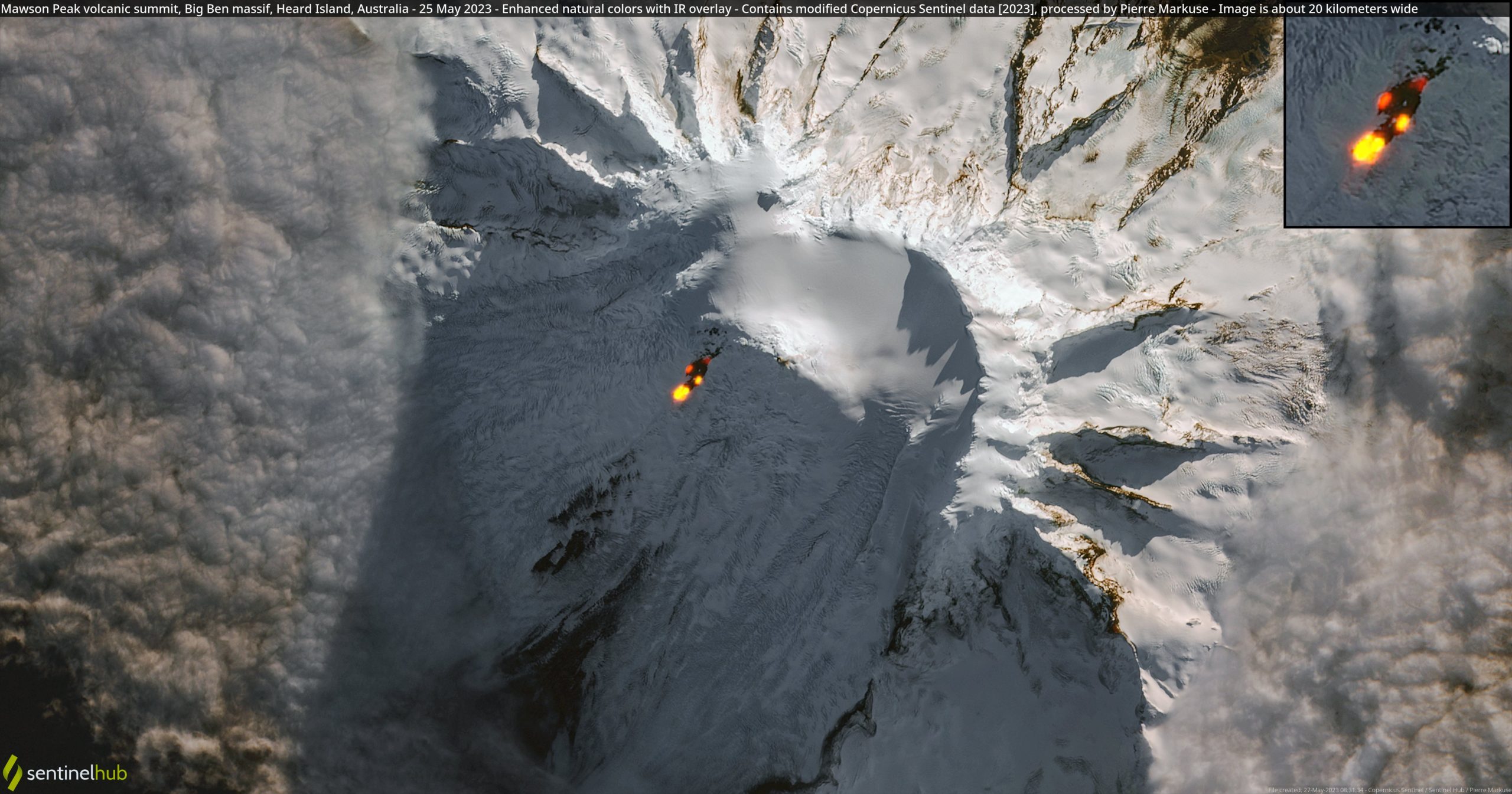 El volcán activo se encuentra en la isla Heard, llamada Big Ben, en territorio australiano, justo fuera del Círculo Polar Antártico. El 25 de mayo 2023 , gracias a las imágenes de satélite tomadas por el satélite Copernicus Sentinel-2 de la Agencia Espacial Europea, se pudo ver la cara blanca del Mawson’s Peak con un reguero de lava amarilla brillante fluyendo por la ladera. No es la primera vez que el volcán entra en erupción. El Programa de Vulcanismo Global de la Institución Smithsonian tiene informes de erupciones del volcán de la isla Heard que se remontan a principios del siglo XX.