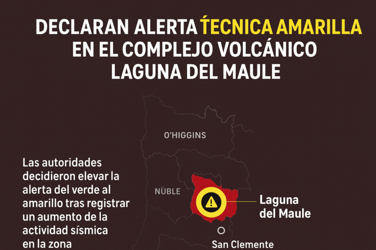 Las autoridades chilenas decretaron este miércoles alerta técnica amarilla para el complejo volcánico Laguna del Maule, en la Región del Maule, tras registrarse un aumento significativo de la actividad sísmica. La medida fue adoptada por el Servicio Nacional de Prevención y Respuesta ante Desastres (Senapred) y el Servicio Nacional de Geología y Minería (Sernageomin) luego de una mesa técnica, elevando el nivel desde verde a amarillo.
